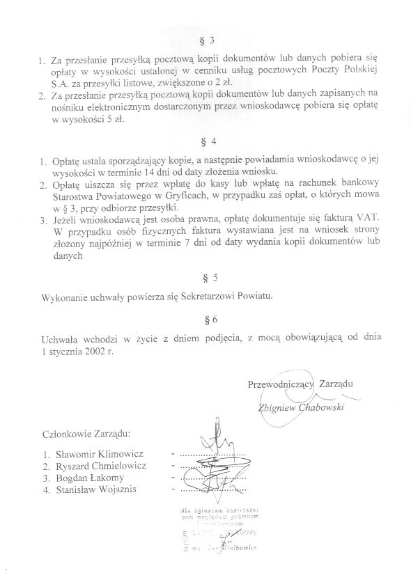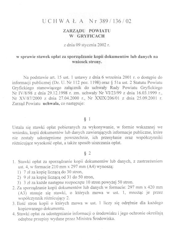 Uchwała Nr 389/136/02 Zarządu Powiatu w sprawie opłat za sporządzanie kopii dokumentów lub danych na wniosek strony